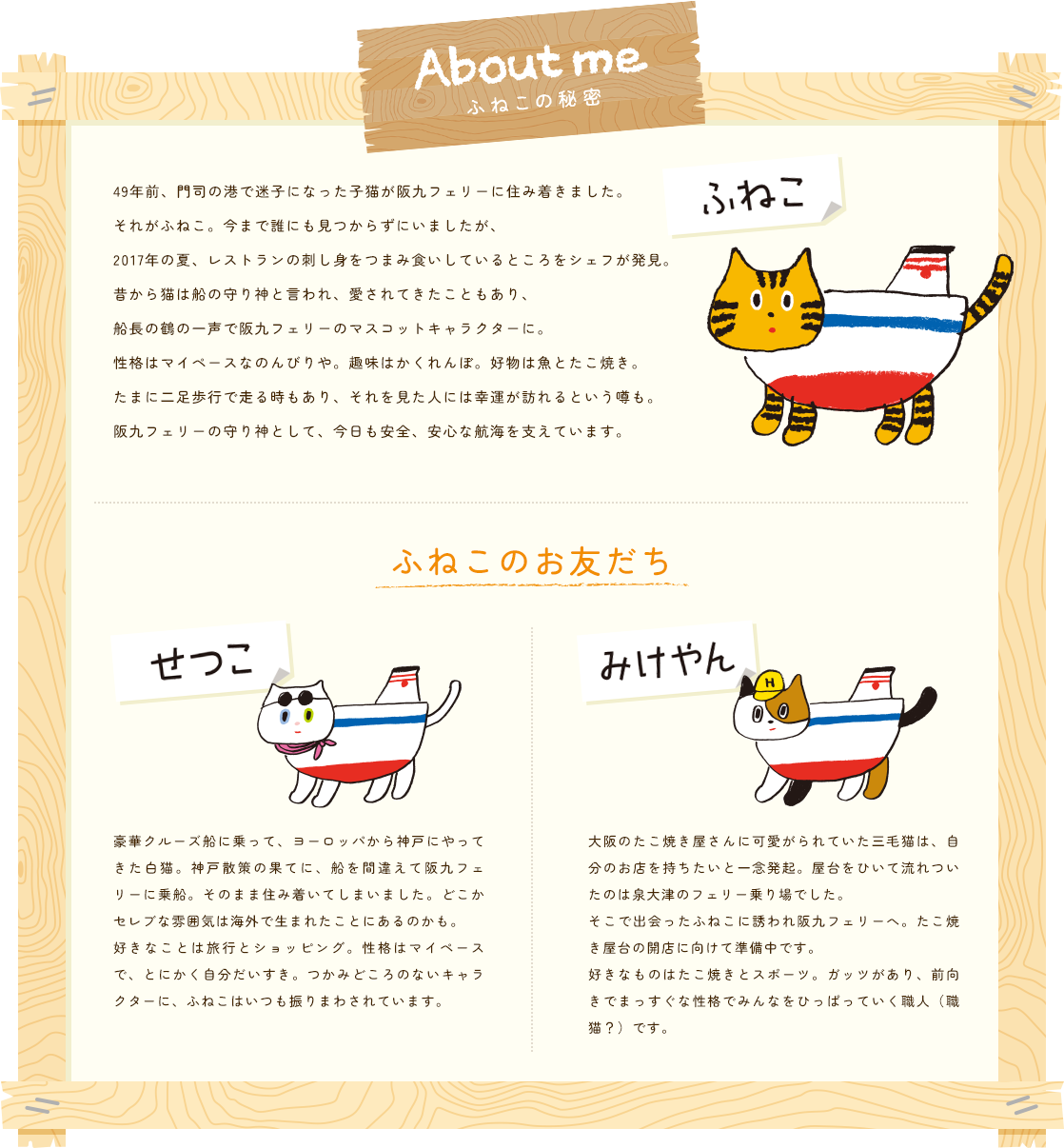 49年前、門司の港で迷子になった子猫が阪九フェリーに住み着きました。それがふねこ。今まで誰にも見つからずにいましたが、2017年の夏、レストランの刺し身をつまみ食いしているところをシェフが発見。昔から猫は船の守り神と言われ、愛されてきたこともあり、船長の鶴の一声で阪九フェリーのマスコットキャラクターに。